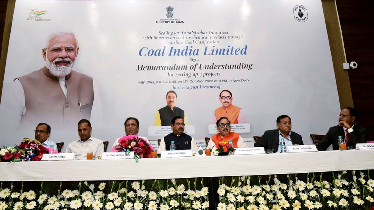 For setting up four large scale coal-to-chemical projects through surface coal gasification route, Coal India Limited (CIL) signed three separate Memorandums of Understanding (MoU), one each, with three major PSUs of the country Bharat Heavy Electricals Limited (BHEL), Indian Oil Corporation Limited (IOCL) and GAIL (India) Limited. In addition, NLC India Limited (NLCIL) is signing MoU with BHEL.
