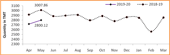 Crude oil production during May, 2019 was 2800.12 TMT which is 3.37% lower than target and 6.91% lower when compared with May 2018. Cumulative crude oil production during April-May, 2019 was 5518.61 TMT which is 1.92% lower than target for the period and 6.82% lower than production during corresponding period of last year. Unit-wise and State-wise crude oil production is given at Annexure-I. Unit-wise crude oil production for the month of May, 2019 and cumulatively for the period April-May, 2019 vis-à-vis same period of last year has been shown in Table-1 and month-wise in Figure-1.