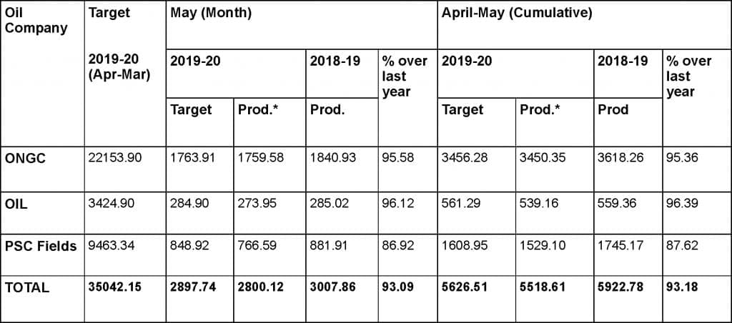 2. Crude oil production by OIL during May, 2019 was 273.95 TMT which is 3.84% lower than monthly target and 3.88% lower when compared with May, 2018. Cumulative crude oil production by OIL during April-May, 2019 was 539.16 TMT which is 3.94% lower than target for the period and 3.61% lower than production during the corresponding period of last year. Major reasons for lower production is less than planned contribution from work over wells and drilling wells.